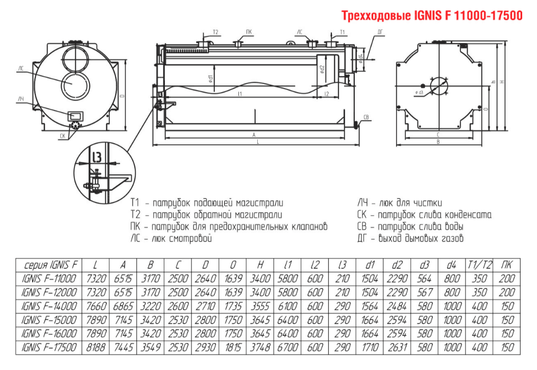 Технические характеристики водогрейного трёхходового котла ARCUS IGNIS F-16000